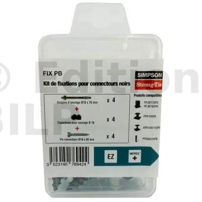 Le FIX PB est un kit permettant la fixation des pieds de poteaux peints en noir de la gamme Nuances. Il se compose de 4 goujons d’ancrage Ø10x78 mm, 4 capuchons Ø10 et 4 vis connecteurs Ø10x60 mm et offre une finition esthétique aux assemblages.