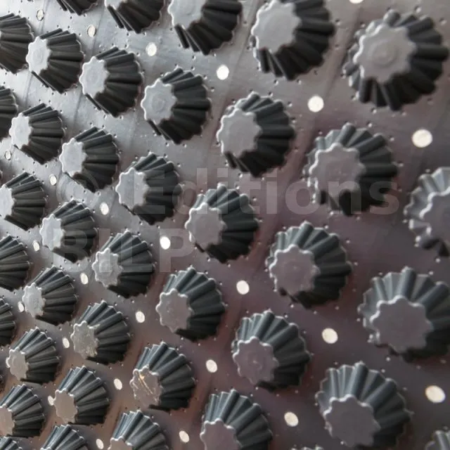 • Les alvéoles octogonales permettent de stocker jusqu’à 7 litres/m² d’eau, l’excédent d’eau s’écoule ensuite sous la membrane via les perforations entre les alvéoles. La membrane est écologique et résistante aux produits chimiques, aux bactéries, aux substances alcalines et aux racines.