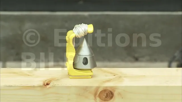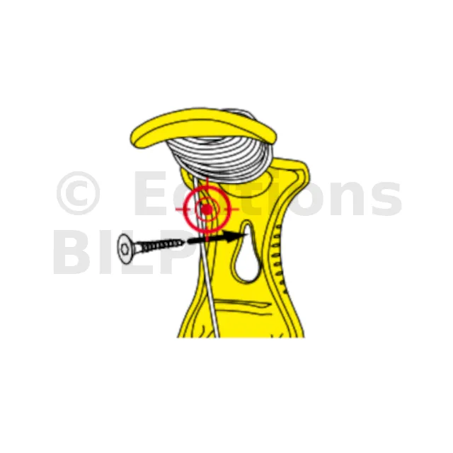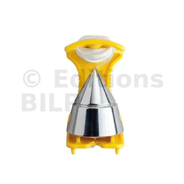 - d’une monture en polymère perforée de couleur jaune vif. La perforation permet de le fixer à une vis, des clous ou autres et de libérer la main de l’utilisateur, tandis que la couleur facilite son identification sur le chantier.