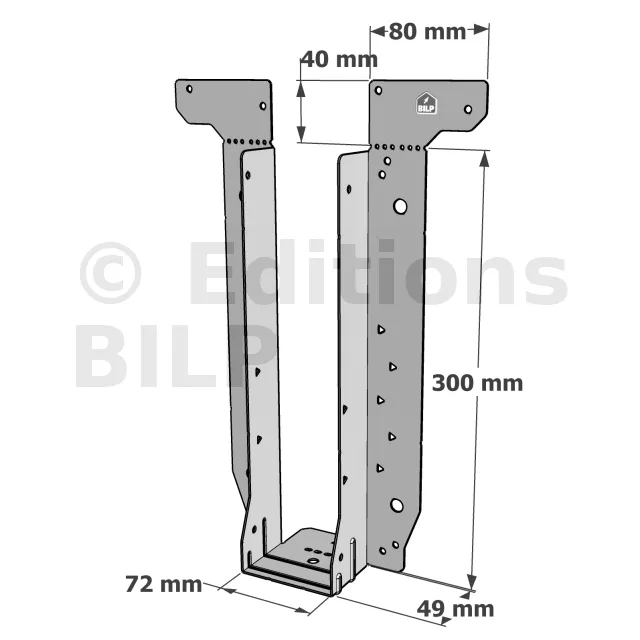 - Étrier fourni avec ses brides supérieures droites, pliables sur chantier afin de s’adapter à toutes les hauteurs de solives,