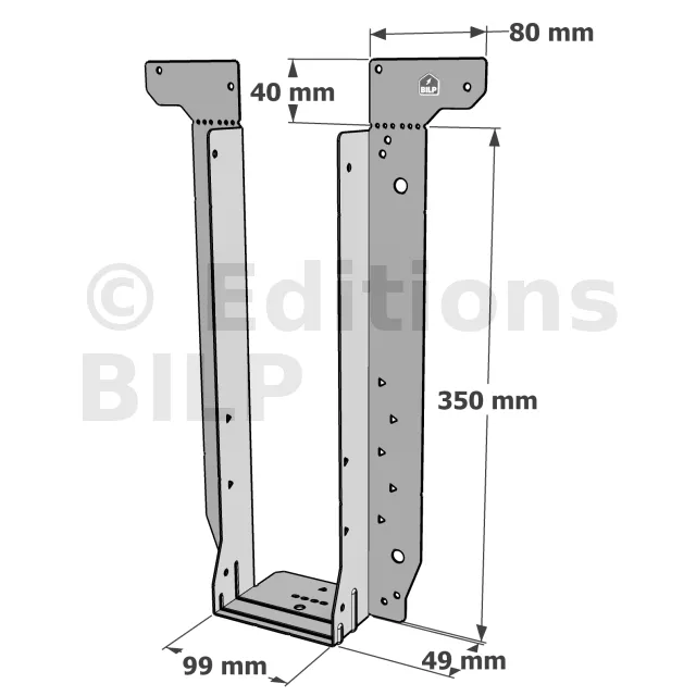 - Étrier fourni avec ses brides supérieures droites, pliables sur chantier afin de s’adapter à toutes les hauteurs de solives,