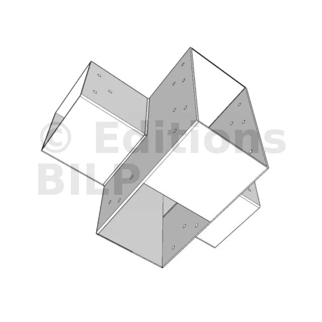 Il permet de raccorder deux poutres 120x120mm perpendiculairement à une grosse poutre 240x120mm, le tout étant supporté par un poteau vertical 120x120mm.