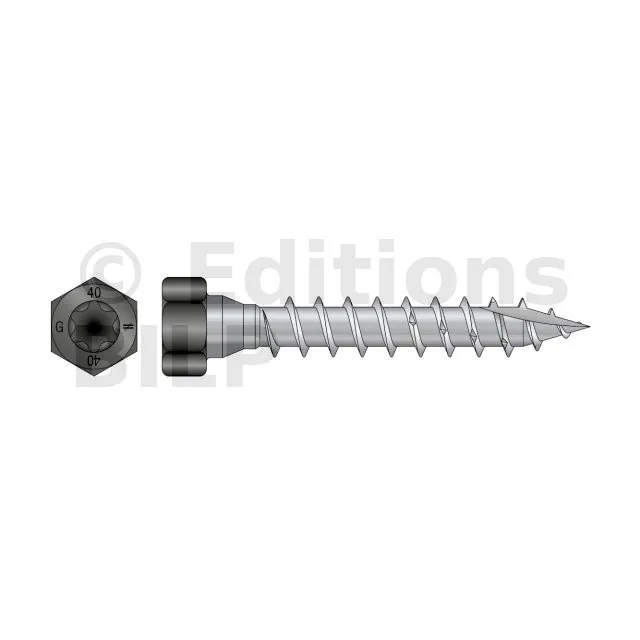 - Tête hexagonale : parfait maintien de la plaque acier sur bois grâce à sa tête large,