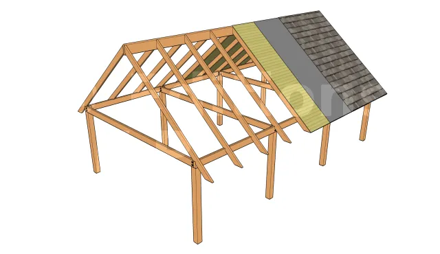 1 : Poteau, 2 : Poutre porteuse, 3 : Panne faîtière, 4 : Chevron arbalétrier, 5 : Tirant, sert à assurer le contreventement et la triangulation des chevrons arbalétriers, 6 : Plancher de toiture en lambris, peut être en particules de bois (OSB) ou autre panneau de bois, 7 : Sous-couche bitumineuse pour l’étanchéité de la toiture, 8 : Bardeau d’asphalte (shingle, bardeau canadien, ...).