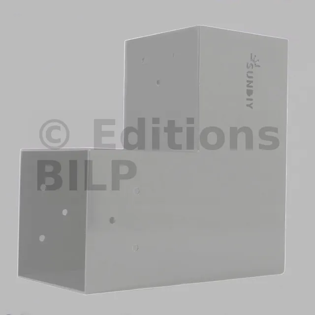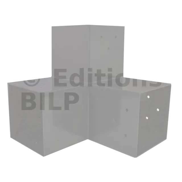 Il est utilisé dans un angle extérieur. Ce connecteur va permettre de raccorder une grosse poutre 120x120mm perpendiculairement à une poutre 120x120mm, le tout étant supporté par un poteau vertical 120x120mm.