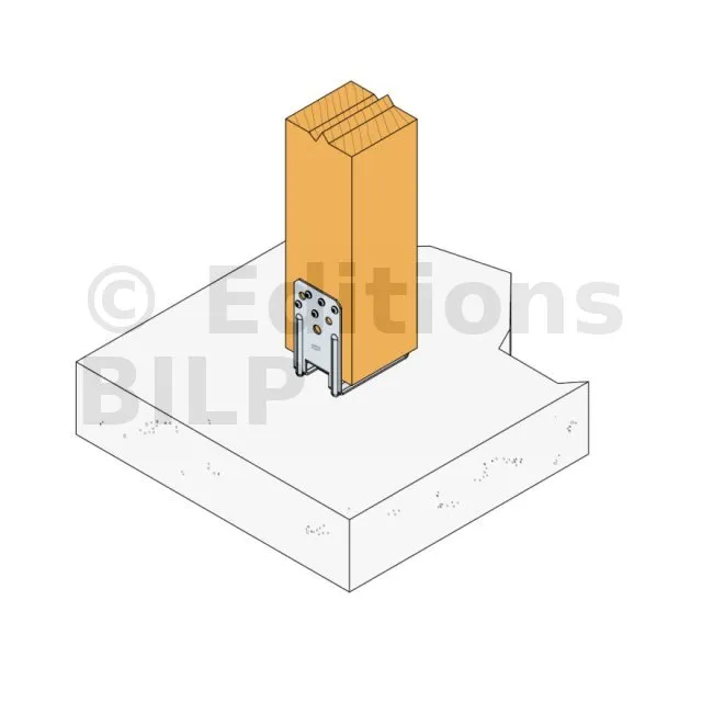 | Pied de poteau en U à sceller PPD | Scellé dans béton frais | Tenue élevée en soulèvement et cisaillement ; fixation discrète | Pose définitive ; nécessite du béton |