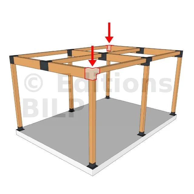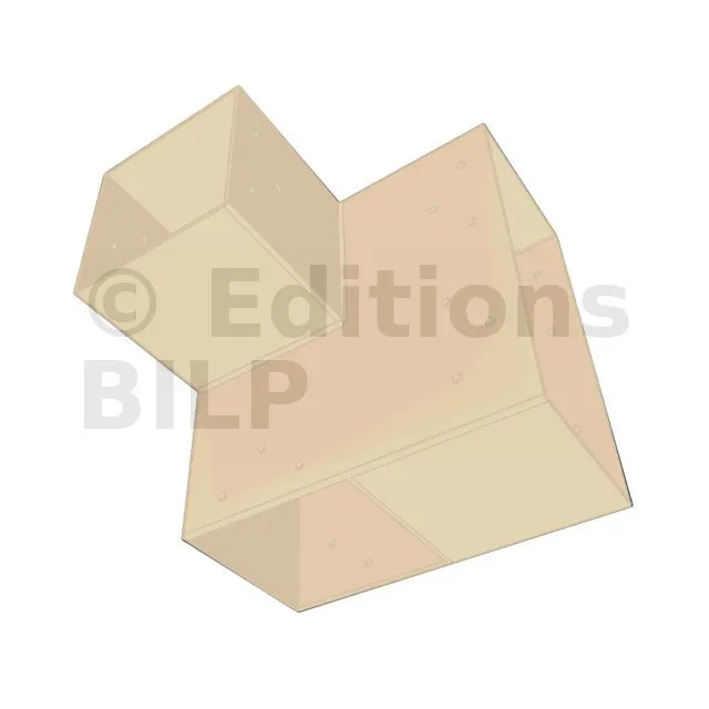 Il est utilisé dans un angle extérieur. Ce connecteur va permettre de raccorder une grosse poutre 240x120mm perpendiculairement à une poutre 120x120mm, le tout étant supporté par un poteau vertical 120x120 mm.