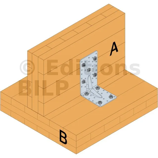 - Fixation BOIS/support rigide - clouage total2 équerres Aile A : 24 CNA Ø4.0x35 ou Ø4.0x50 mm ou Aile B : 4Ø10 (boulon ou tirefond)