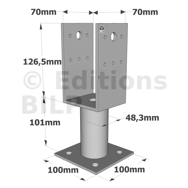 Ce pied de poteau en U avec platine permet de fixer un poteau sur une dalle béton tout en résistant à des efforts dans les 4 directions.