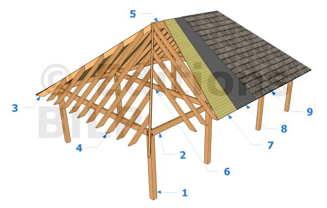 - Le TPB195 ne convient pas pour des applications structurelles soumises à des efforts latéraux (vent...). Les structures doivent être correctement conçues et mises en œuvre afin de résister à ce type d’efforts (jambe de force...).Préau NANTE avec couverture en shingle - vue éclatée