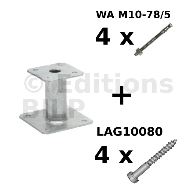 Les vis Ø10x80 pour fixation du poteau peuvent être des tirefonds LAG 10x80 ou vis SSH Ø10x80(réf 75152).