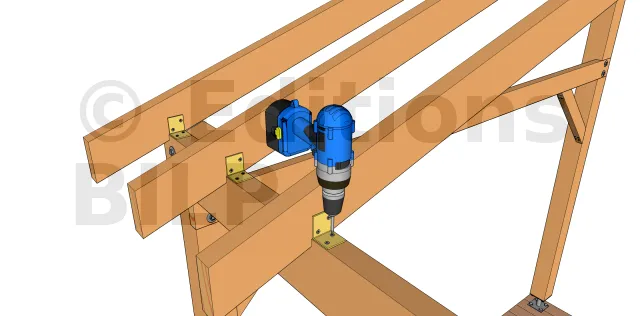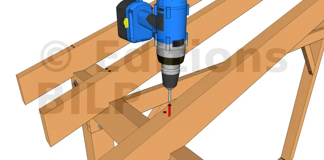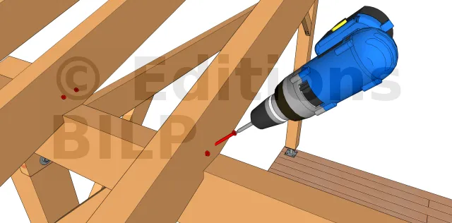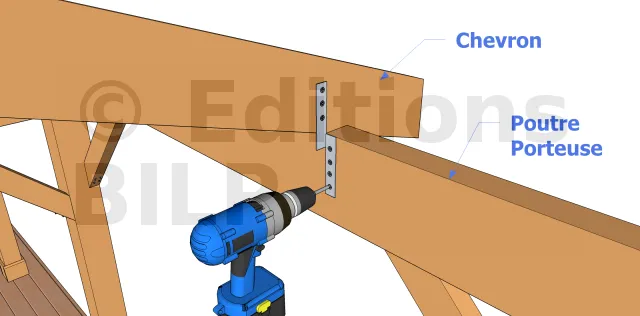 On insère 2 vis à 45° sur les 2 faces de chaque chevron de façon à traverser le chevron et à le visser dans la panne. La longueur des vis doit donc être suffisante. C’est une technique permettant une certaine économie et qui fonctionne avec des chevrons de toutes les hauteurs mais n’est pas plus fiable que la technique précédente.
