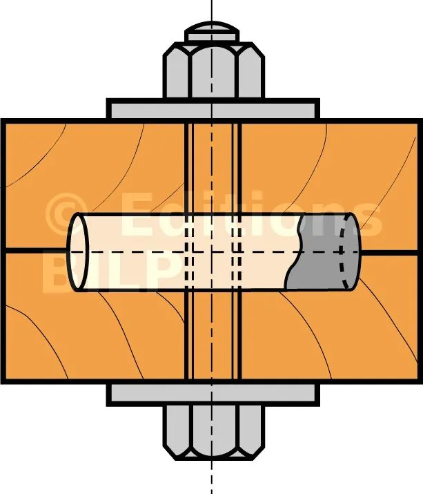1. Usiner les deux éléments bois en réalisant les gorges circulaires et les perçages pour le boulon.