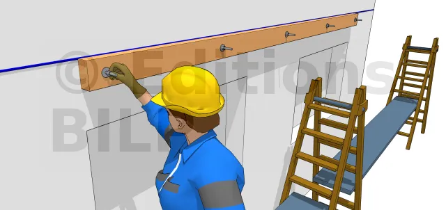Après avoir placé les tiges filetées, laissez reposer pendant environ 3 à 5 mn pour la prise de la pâte. Replacez ensuite la panne à travers les tiges filetées en tapant dessus. Fixez les rondelles et les écrous temporairement sur les tiges. Après quelques heures de durcissement du scellement, vous pouvez serrer les écrous à fond.