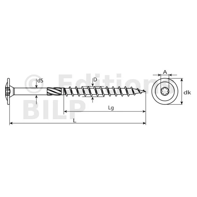 La vis charpentier tête large bombée et utilisée pour les liaisons bois/bois dans la construction bois (par ex. isolation de toiture, cadres en bois, combles, construction d’éléments, préfabriqué, escaliers etc.).