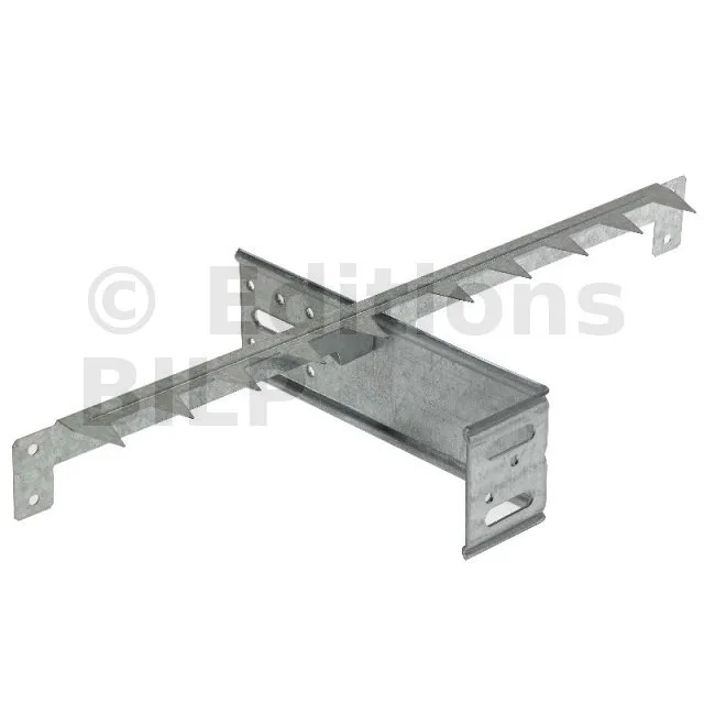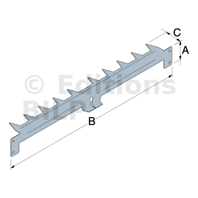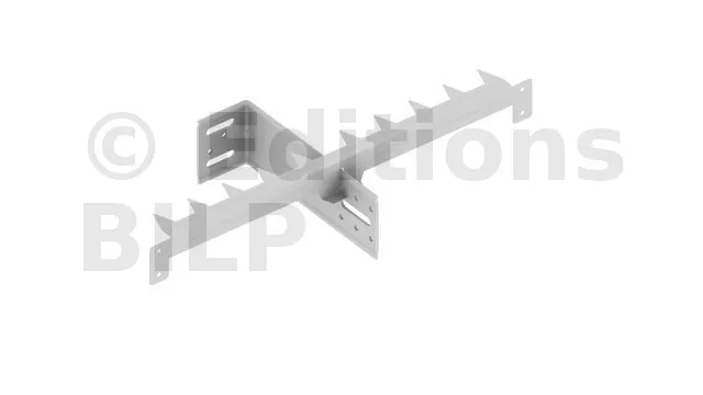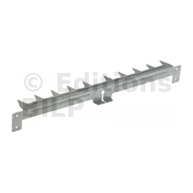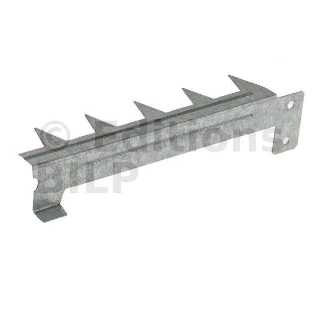 Il faut compter une griffe par équerre pour une bonne fixation de l’isolant. Peut-être coupée pour obtenir deux peignes à fixer sur les chevrons grâce aux deux ailettes qui permettront le maintien de la seconde couche d’isolation entre chevrons.