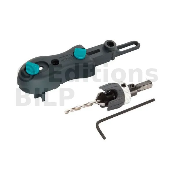 - Contenu1 guide de perçage mobile pour terrasse bois, avec douilles de perçage 4 mm en acier trempé, 1 foret d’amorçage, avec fraisoir - foret HSS ø 4 mm