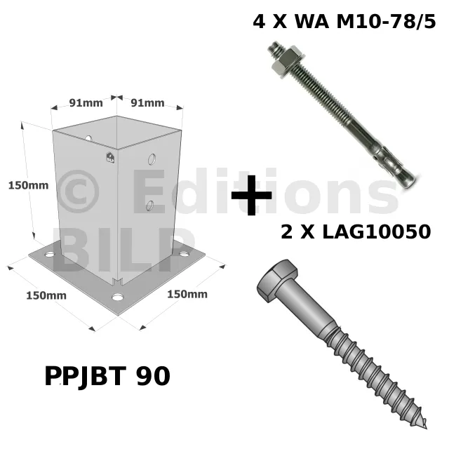 - 1 pied de poteau PPJBT70 ou PPJBT90 en acier galvanisé à chaud,