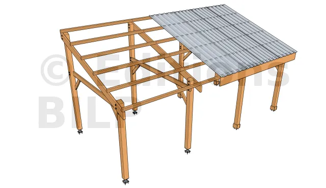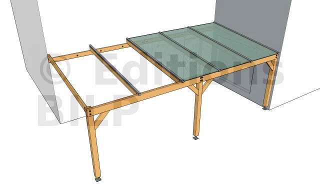1 : Poteau, 2 : Panne déversante, 3 : Chevron, 4 : Bras de contreventement, 5 : Tirant, 6 : Planche de rive, 7 : Pied de poteau, 8 : Couverture en bac acier, 9 : Finition pied de poteau.