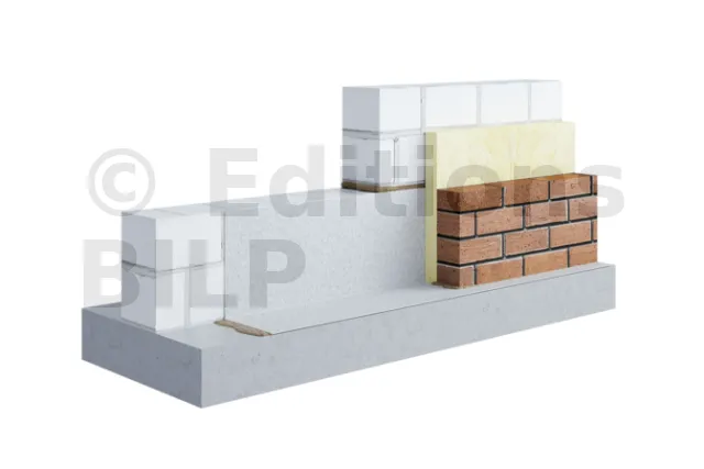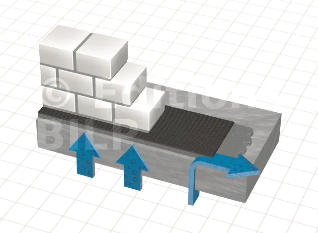 - Ouvrages en maçonnerie (DTU 20.1) : La bande DELTA®-PROTEKT est placée entre deux couches de mortier de ciment, à une hauteur d’au moins 15 cm au-dessus du niveau final du sol extérieur.