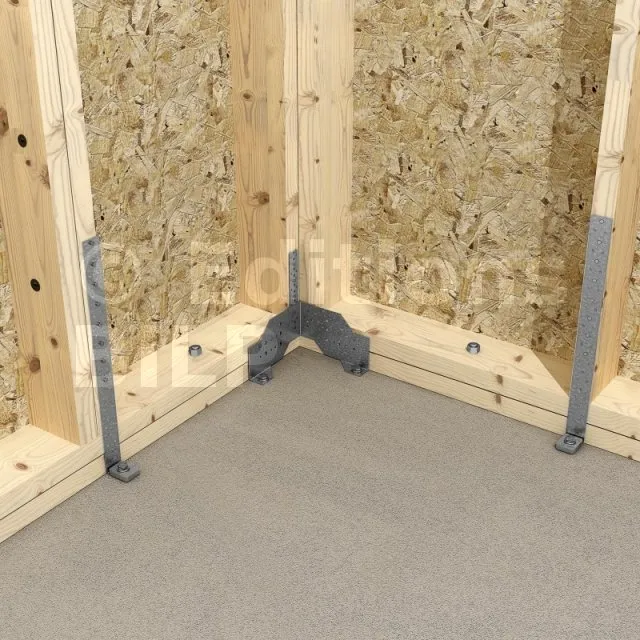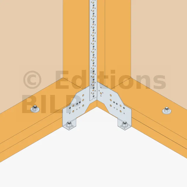 Le connecteur pour panneau bois FCC assure la liaison de murs d‘ossature sur dalle béton. Les trous de pointes et de boulons permettent d‘adapter la fixation en fonction des configurations. Cette référence peut éventuellement être associée à un feuillard perforé type FP30 à fixer sur les montants.