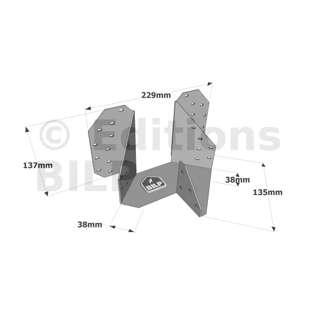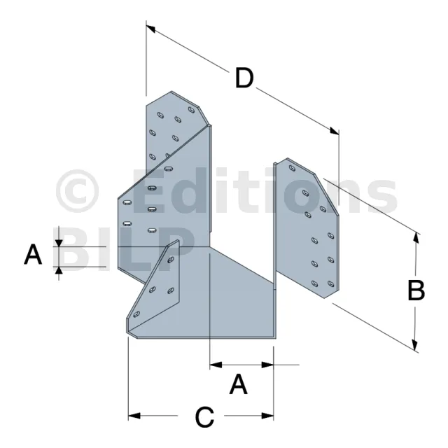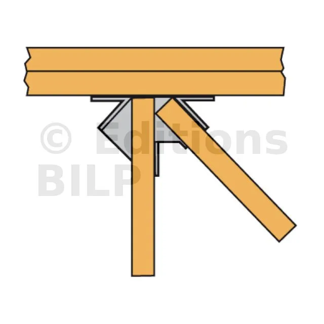 L’étrier pour croupe THJA26 est utilisé dans la fermette de section 38mm. Il permet la réalisation d’une croupe en assemblant les demi-fermes d’arêtier et d’empannon.