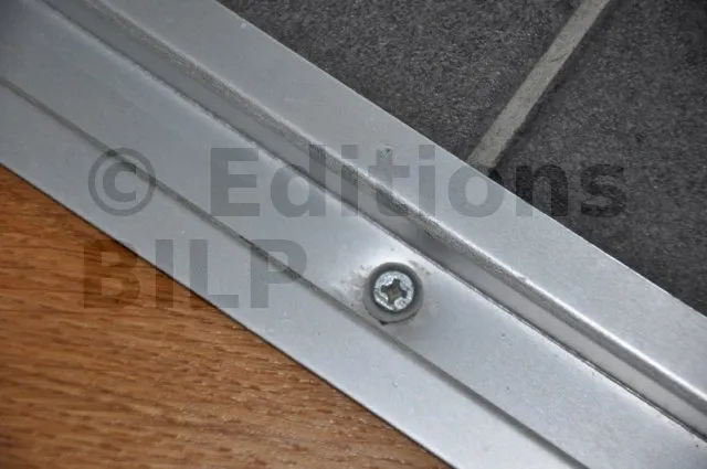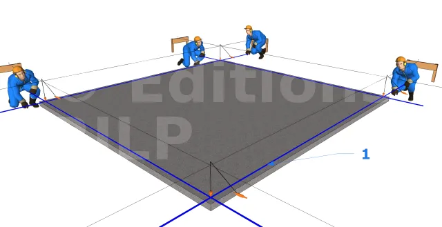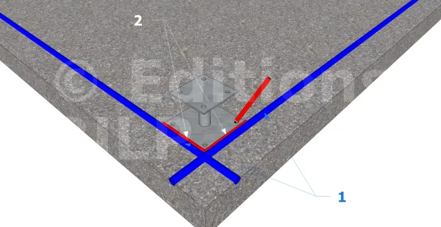 A chaque coin du tracé, placez le pied de poteau en alignant les deux côtés de la base de la platine avec les deux lignes de repère perpendiculaires. Vous pouvez ainsi repérer au crayon les points de fixation des accessoires de fixation des pieds de poteaux.