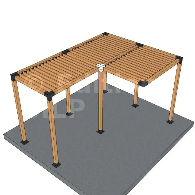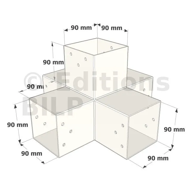 Il permet de raccorder deux poutres 90x90mm perpendiculairement à une autre poutre 90x90mm, le tout étant supporté par un poteau vertical de 90x90mm.