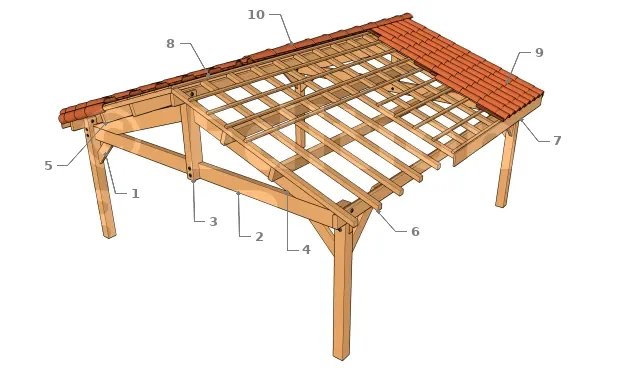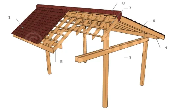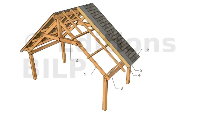 1 : Poteau, 2 : Poutre porteuse, 3 : Panne faîtière, 4 : Chevron arbalétrier, 5 : Tirant, sert à assurer le contreventement et la triangulation des chevrons arbalétriers, 6 : Plancher de toiture en lambris, peut être en particules de bois (OSB) ou autre panneau de bois, 7 : Sous-couche bitumineuse pour l’étanchéité de la toiture, 8 : Bardeau d’asphalte (shingle, bardeau canadien, ...).