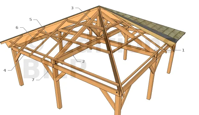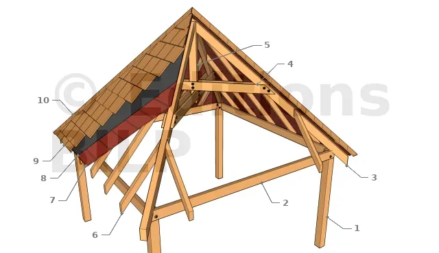 1 : Poteau, 2 : Poutre porteuse, 3 : Chevron arbalétrier, 4 : Entraits moisés retroussés superposés, 5 : Poinçon, 6 : Empanon, 7 : Plancher de toiture épais, 8 : Sous-couche bitumineuse, 9 : Bardeau de bois, 10 : Faîtière.